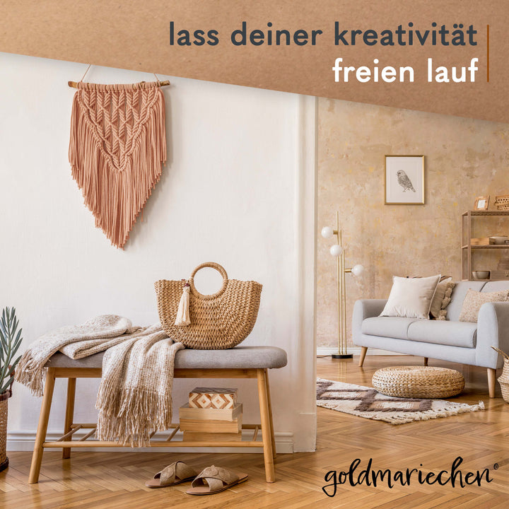 Das goldmariechen Makramee-Garn besteht aus 100% reiner Baumwolle und bietet ein wunderbares Verarbeitungserlebnis. Es ist leicht zu kämmen und zugleich robust genug, um auch größere Projekte wie Traumfänger oder Wandbehänge zu ermöglichen. Mit einer Produktion in Europa, sowie umweltfreundlicher und plastikfreier Verpackung das Garn von goldmariechen perfekt für alle, die höchste Garnqualität und Umweltbewusstsein in einem suchen.