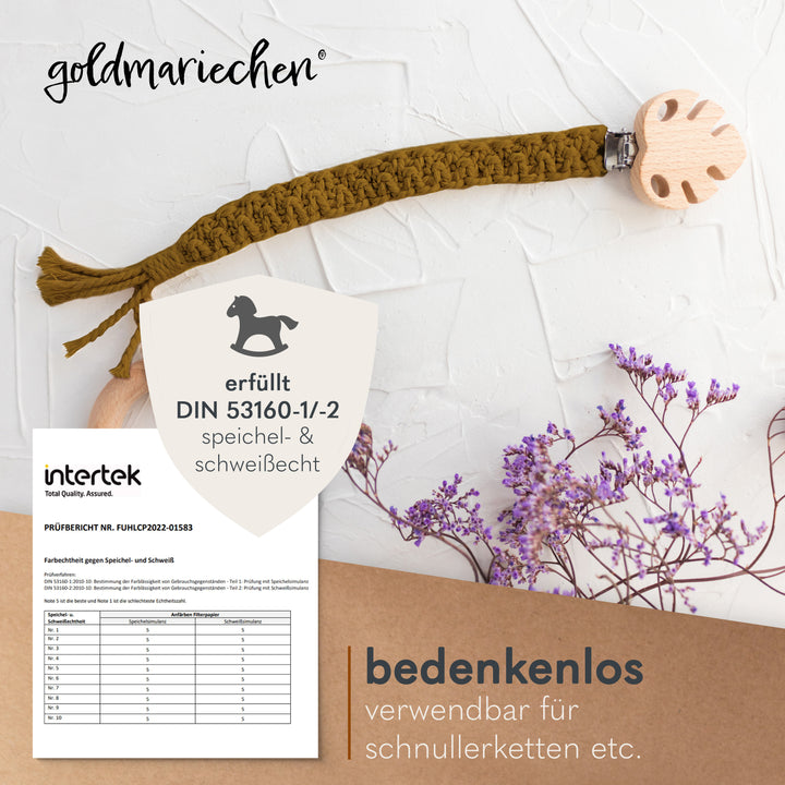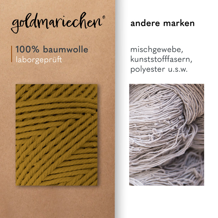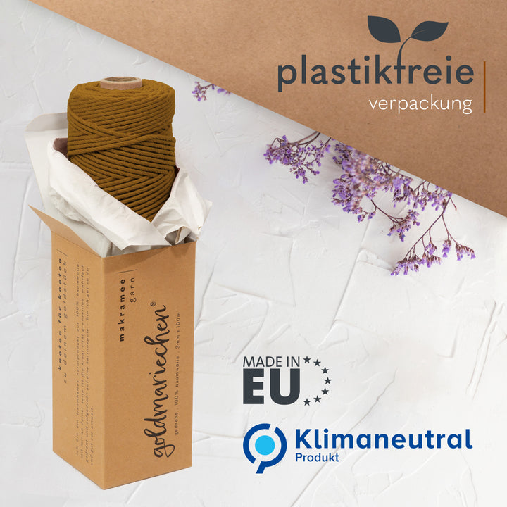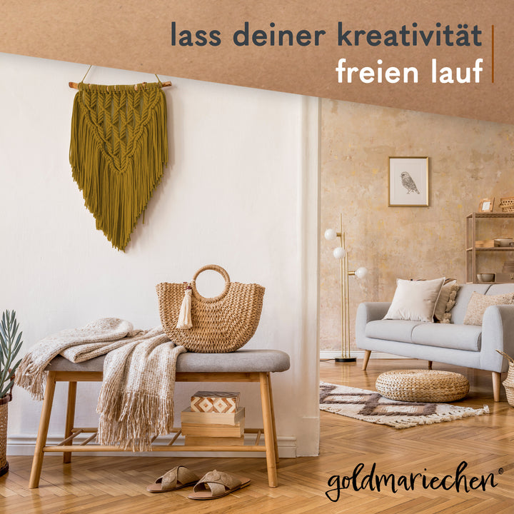 Mediterran, traditionell, rustikal. Unser Makramee-Garn in Olivbraun hat viele Facetten. Der Farbton erinnert an alte Schreibmaschinen oder Vintage-Kommoden und gibt jedem Projekt eine starke Komponente. Probiere es doch mal aus für Wandbehänge und Traumfänger - oder viele weitere, tolle Makramee-Kunstwerke. Makramee-Garn von goldmariechen steht für ein besondere Kombination aus Qualität und Nachhaltigkeit. Das Garn aus 100% reiner Baumwolle sorgt für ein natürlichen Look und ein angenehmes Knüpf-Gefühl. Es ist leicht auskämmbar und gleichzeitig stabil genug, um auch größere Projekte wie Traumfänger oder Wandbehänge zu bewältigen. Mit plastikfreier Verpackung und klimaneutraler Produktion in Europa setzt goldmariechen gleichermaßen auf Nachhaltigkeit und Garnqualität.