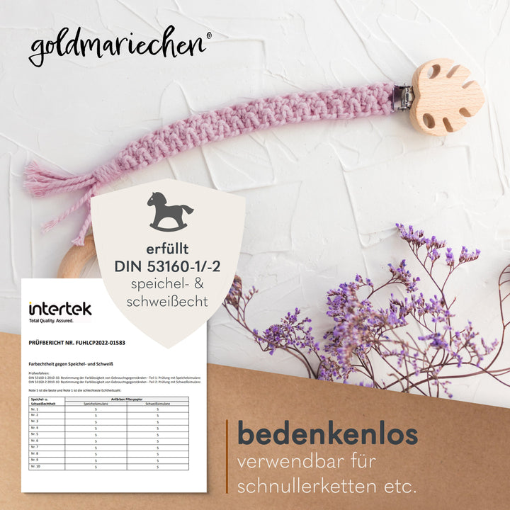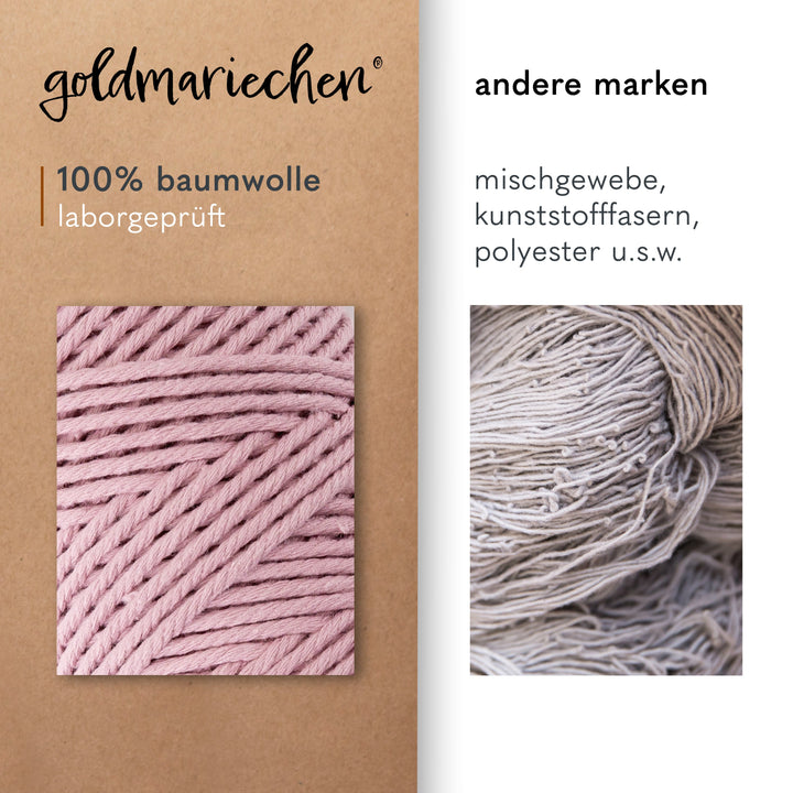 So sanft, wie eine ehrliche Umarmung. Unser Farbton Rose wirkt romantisch, feminin und gibt jedem Projekt einen Hauch von Zärtlichkeit. Vermittelt in Kombination mit anderen, leichten Farbtönen eine wunderschöne Harmonie. So sorgt dein nächstes Makramee-Kunstwerk für einen Hauch von Leichtigkeit. Bei goldmariechen erhältst Du Makramee-Garn aus 100% reiner Baumwolle. Es besticht durch seine natürliche Optik und ein angenehmes Gefühl bei der Verarbeitung. Das Garn ist leicht auskämmbar und gleichzeitig stabil genug für größere Projekt, wie zum Beispiel Wandbehänge, Traumfänger oder Blumenampeln. Es wird plastikfrei und klimaneutral in Europa hergestellt und steht für höchste Garn-Qualität und ein ökologisches Bewusstsein in einem.
