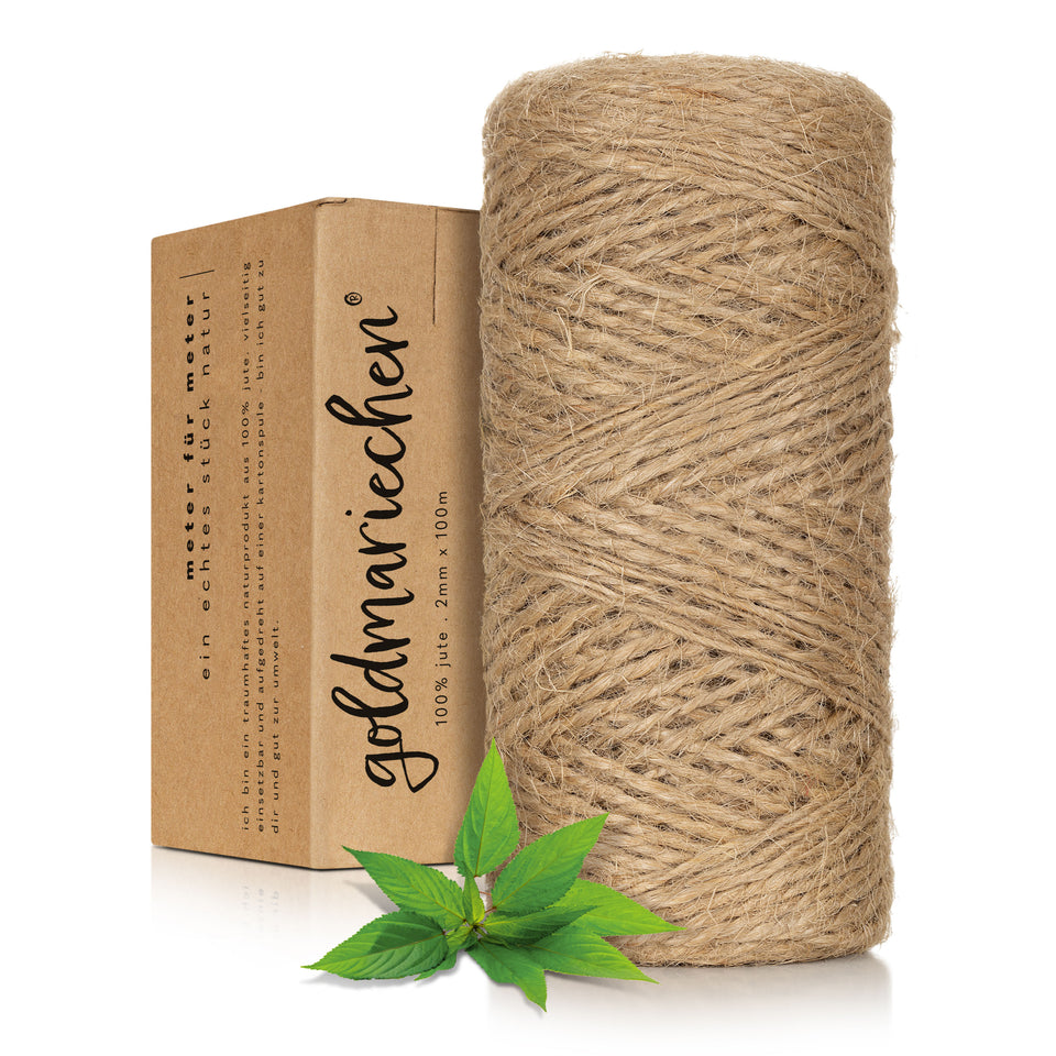 100 Meter natürliches Jute-Garn. Für kreative Köpfe und fleißiges Werkeln. Das Jute-Garn von goldmariechen besteht zu 100% aus reiner Jute und sorgt dadurch für eine natürliche Optik und ein angenehmes Gefühl beim Verarbeiten. Zum stilvollen Verpacken von Geschenken, bei der Gartenarbeit oder jegliche Form von Basteln und DIY. Jute-Garn ist äußerst vielseitig und findet deshalbt zahlreiche Einsatzmöglichkeiten. Natürlich verzichten wir auch bei unserem Jute-Garn vollständig auf Plastikverpackungen und kompensieren den CO2-Ausstoß aus Produktion und Transport vollständig durch die Unterstützung von Klimaprojekten weltweilt, wie z.B. Windkraftparks in Brasilien. Ein rundes Gesamtpaket mit der extra Portion Nachhaltigkeit.