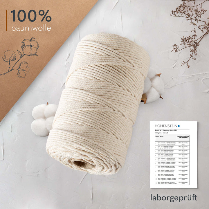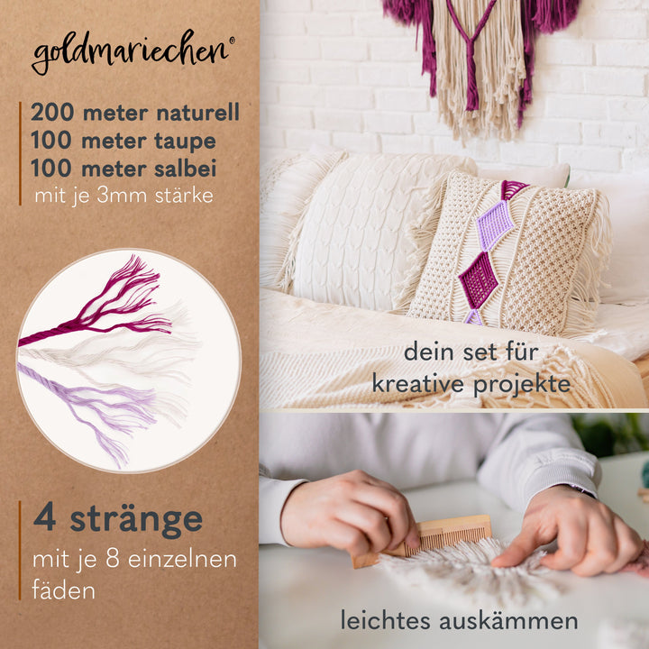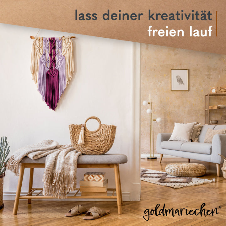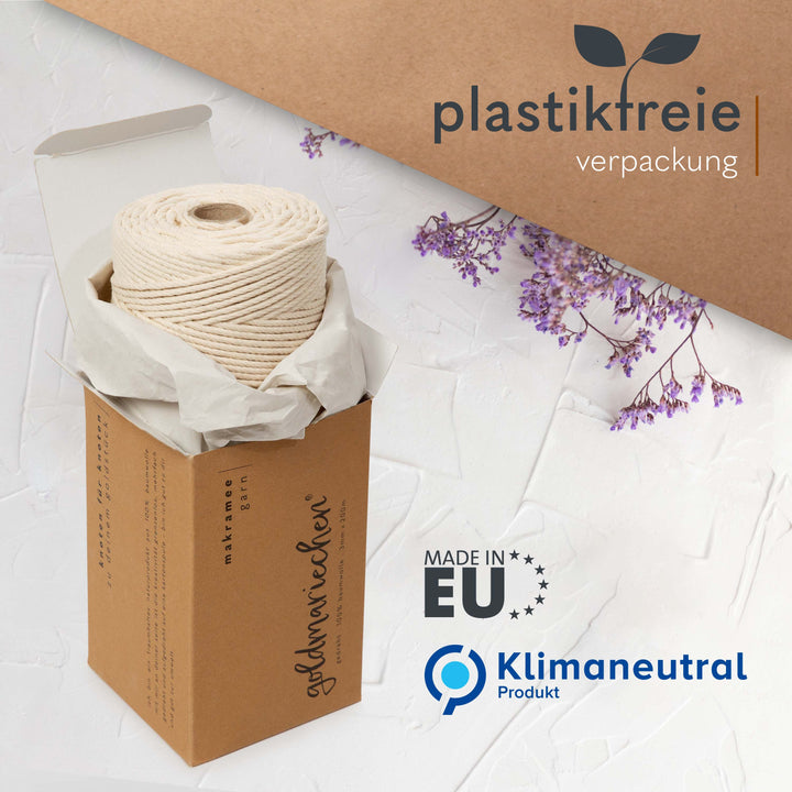 goldmariechen bietet Dir ein hochwertiges Makramee-Garn aus 100% reiner Baumwolle. Es ist leicht auskämmbar und gleichzeitig stabil genug für größere Projekte wie Tramfänger, Blumenampeln und vieles mehr. Dank seiner natürlichen Optik und der angenehmen Verarbeitung wird es Dir viel Freude bereiten. Außerdem kannst Du sicher sein, dass es plastikfrei und klimaneutral in Europa hergestellt wird - goldmariechen steht für Qualität und Nachhaltigkeit!