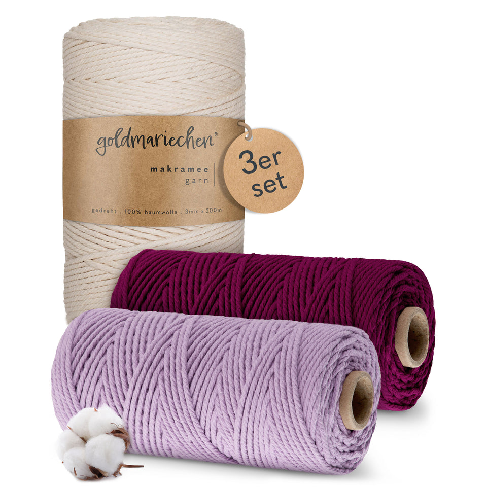 Fruchtige Beere meets Lavendel. Diese wunderbare Kombination gehört für uns einfach in ein praktisches Set. Zu einer 200-Meter-Rolle unseres Makramee-Garns in der Ausführung Naturell gesellen sich die beiden 100-Meter Rollen in den Farben Beere und Lavendel. Das harmoniert auf den ersten Blick