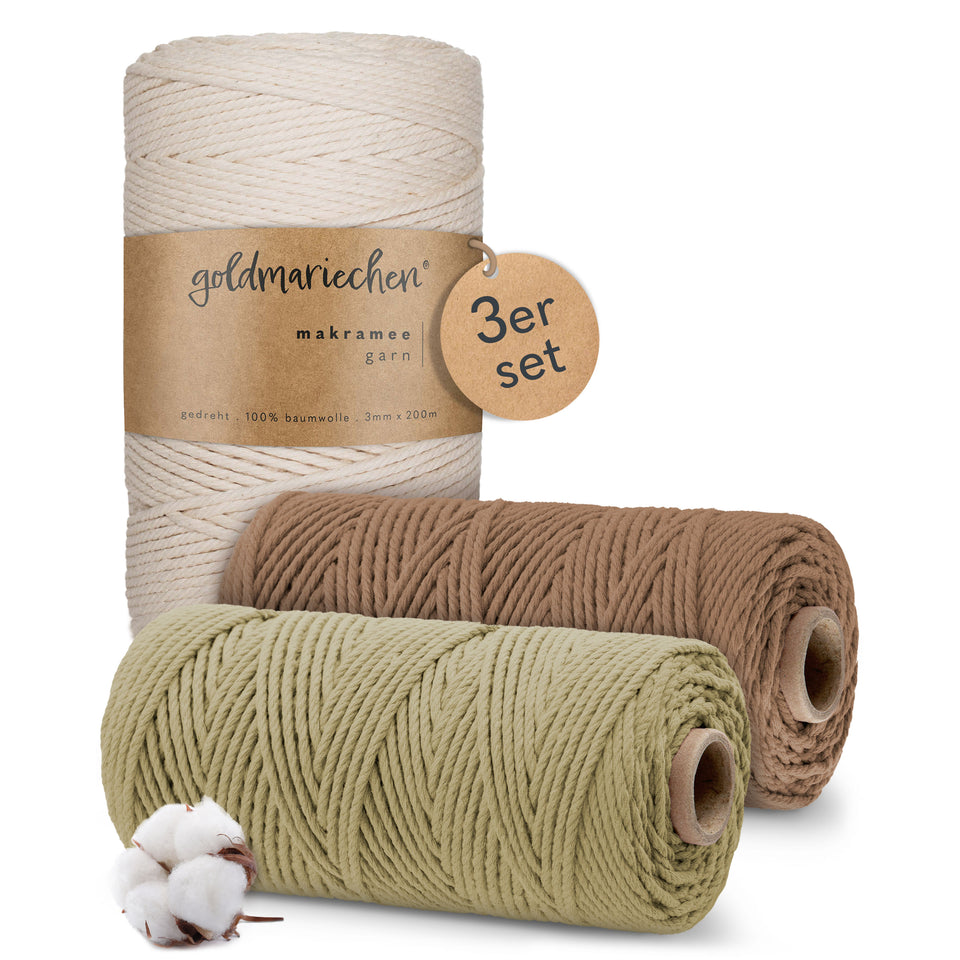 Die passen einfach zusammen. Taupe und Salbei sind wie füreinander gemacht. Und deshalb gibt es die beiden im praktischen Set. Zu einer 200-Meter-Rolle unseres Makramee-Garns in der Ausführung Naturell gesellen sich die beiden 100-Meter Rollen in den Farben Taupe und Salbei. Was für ein schöner Anblick.
