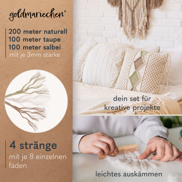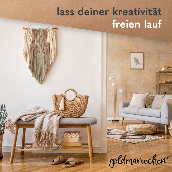 Bei goldmariechen erhältst Du Makramee-Garn aus 100% reiner Baumwolle. Es besticht durch seine natürliche Optik und ein angenehmes Gefühl bei der Verarbeitung. Das Garn ist leicht auskämmbar und gleichzeitig stabil genug für größere Projekt, wie zum Beispiel Wandbehänge, Traumfänger oder Blumenampeln. Es wird plastikfrei und klimaneutral in Europa hergestellt und steht für höchste Garn-Qualität und ein ökologisches Bewusstsein in einem.