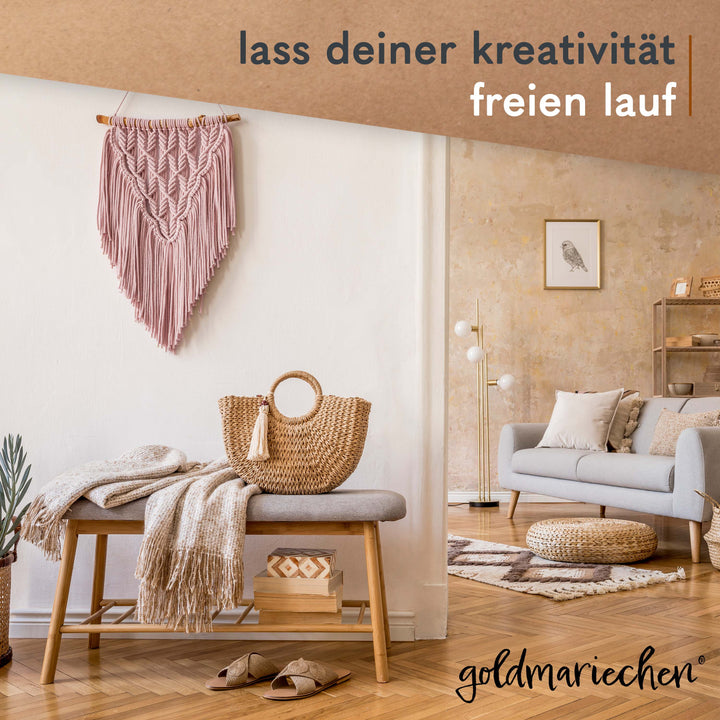 Wie ein zartes Rosenblatt schmiegt sich unser Garn in Altrosa an deiner Finger. Der zarte Farbton gibt deinen Makramee-Projekten einen Hauch von Eleganz und macht jeden Knoten einzigartig. Ein Traum sind zum Beispiel originelle Makramee-Ohrringe in der Farbe Altrosa. Ein echter Blickfang und einfach wunderschön. goldmariechen bietet Dir ein hochwertiges Makramee-Garn aus 100% reiner Baumwolle. Es ist leicht auskämmbar und gleichzeitig stabil genug für größere Projekte wie Tramfänger, Blumenampeln und vieles mehr. Dank seiner natürlichen Optik und der angenehmen Verarbeitung wird es Dir viel Freude bereiten. Außerdem kannst Du sicher sein, dass es plastikfrei und klimaneutral in Europa hergestellt wird - goldmariechen steht für Qualität und Nachhaltigkeit!